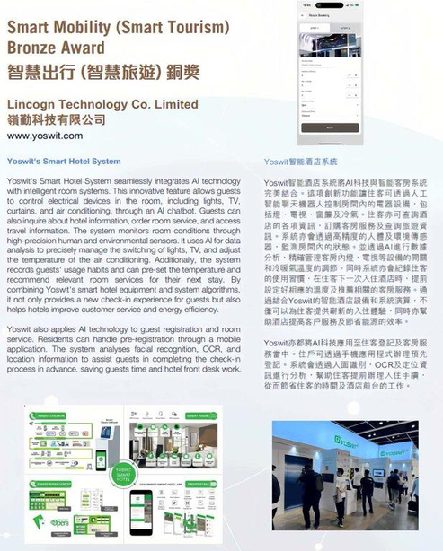 The presentation ceremony for the Hong Kong ICT Awards 2024 was held this evening (November 22). Yoswit is also the winner of the Smart Mobility Award, surpassing other competitor with its winning entry "AI Smart Hotel System".